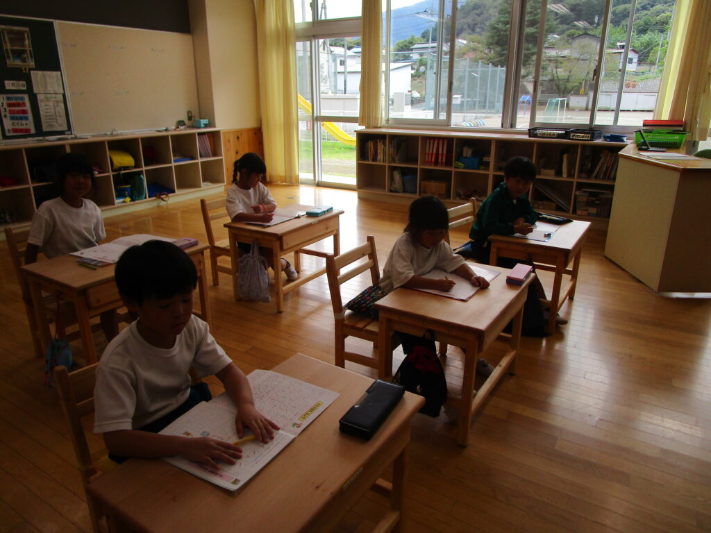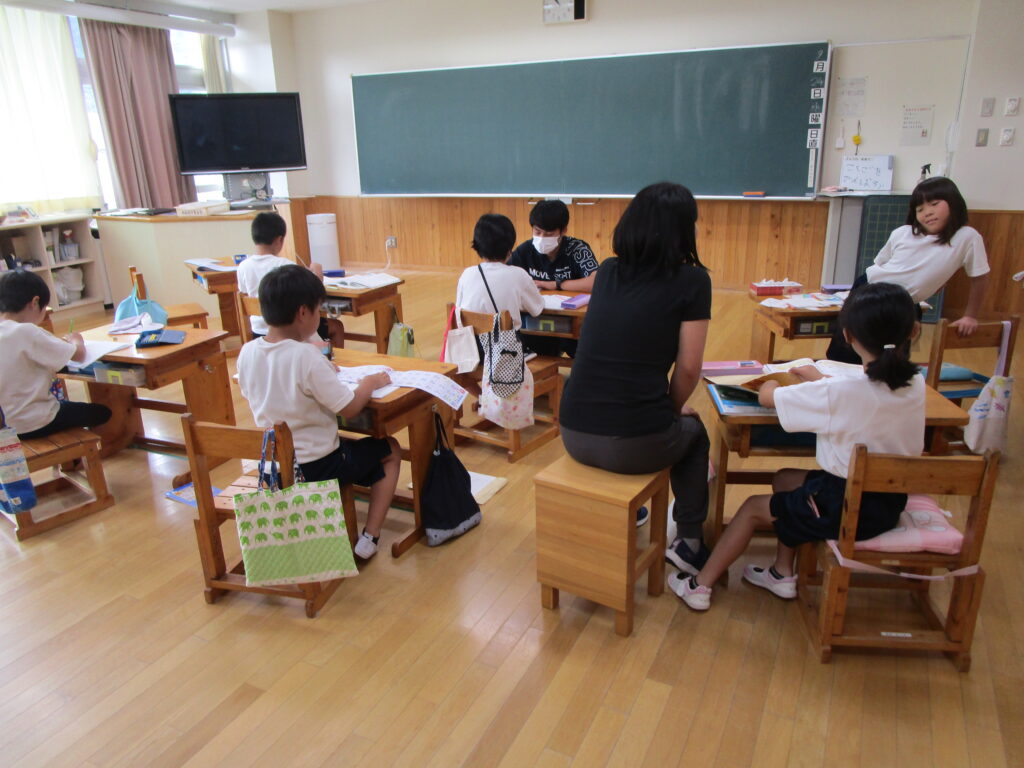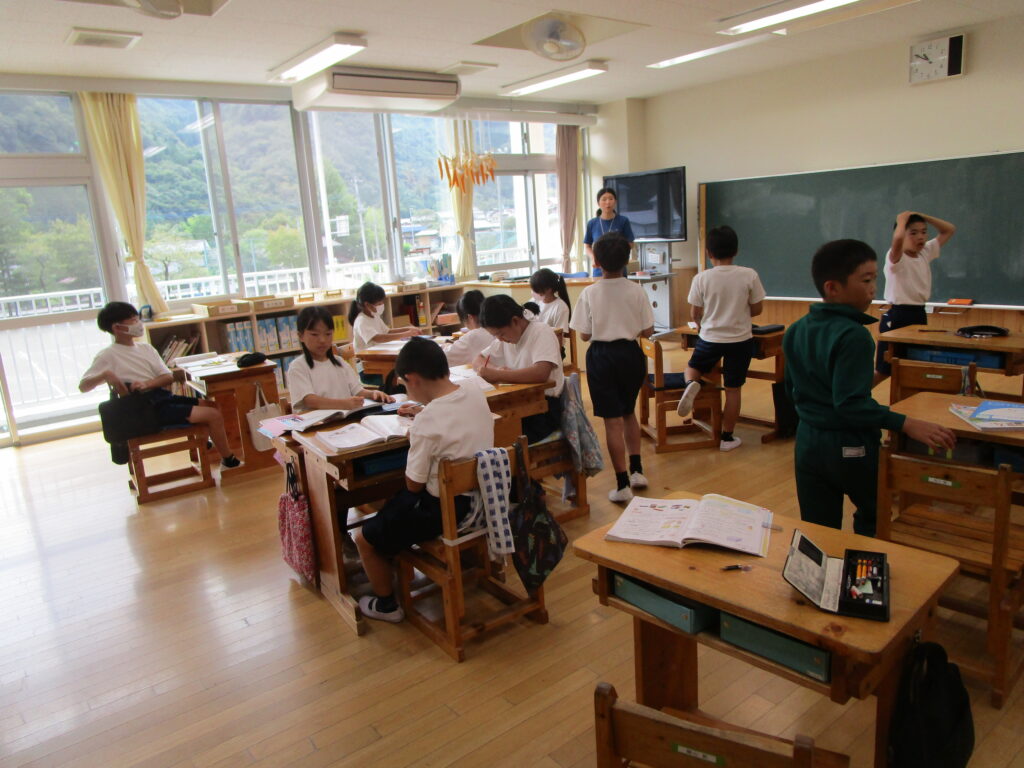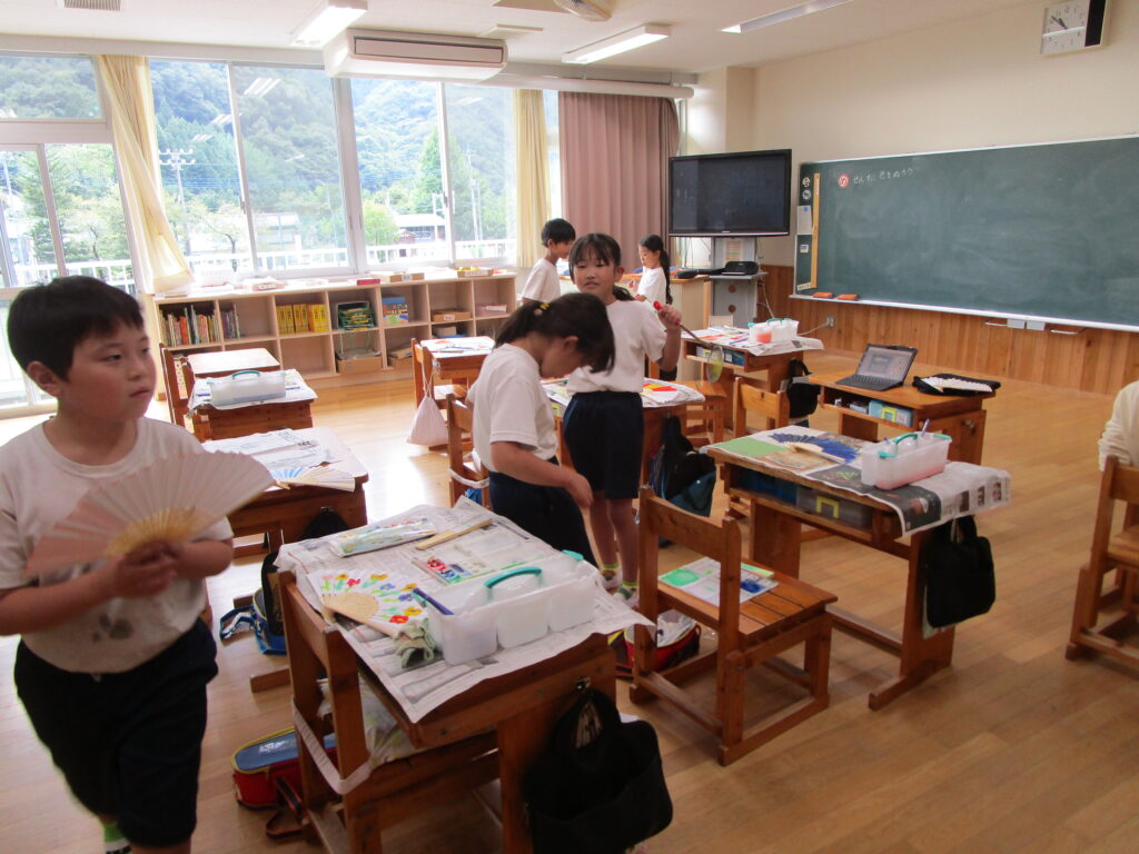 5年生図工。全校ダンスで使う扇子の色塗りを行いました。先に色塗りを行った3年生が参考にしていいよと5年生に見せていました。