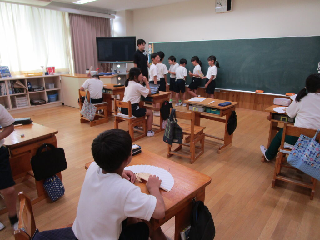 3年生図工。扇子の色塗りも仕上げに移っていました。服や体に色が付いてしまうくらい大胆に、そして集中して取り組んでいました。自分だけのオリジナルに仕上がりました。