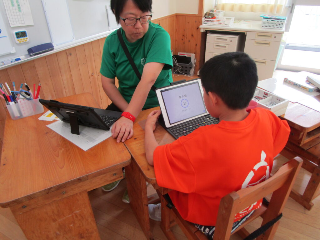 2組算数。たしざんの学習を行いました。タブレットで問題を解いていました。
