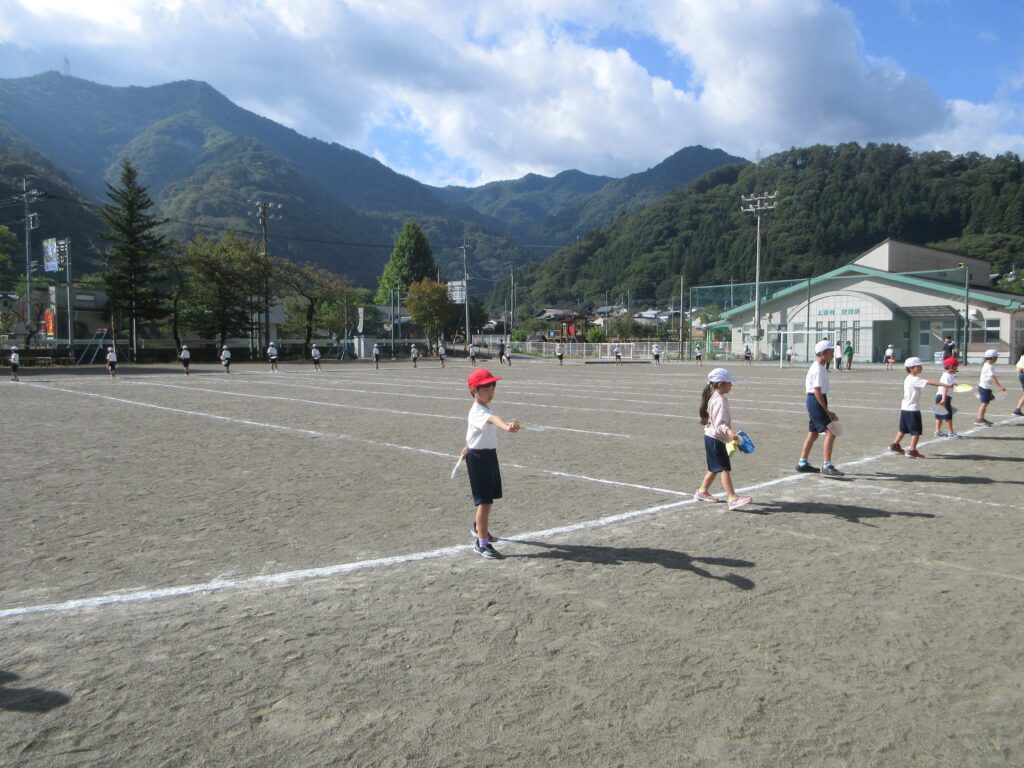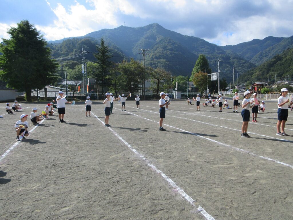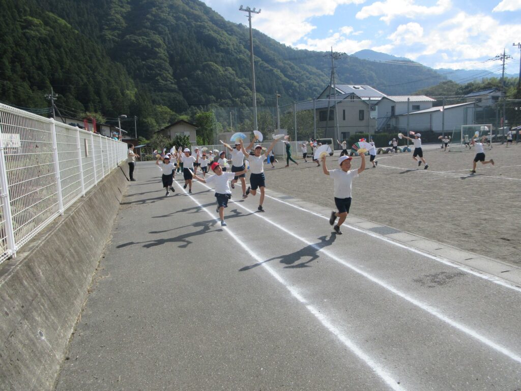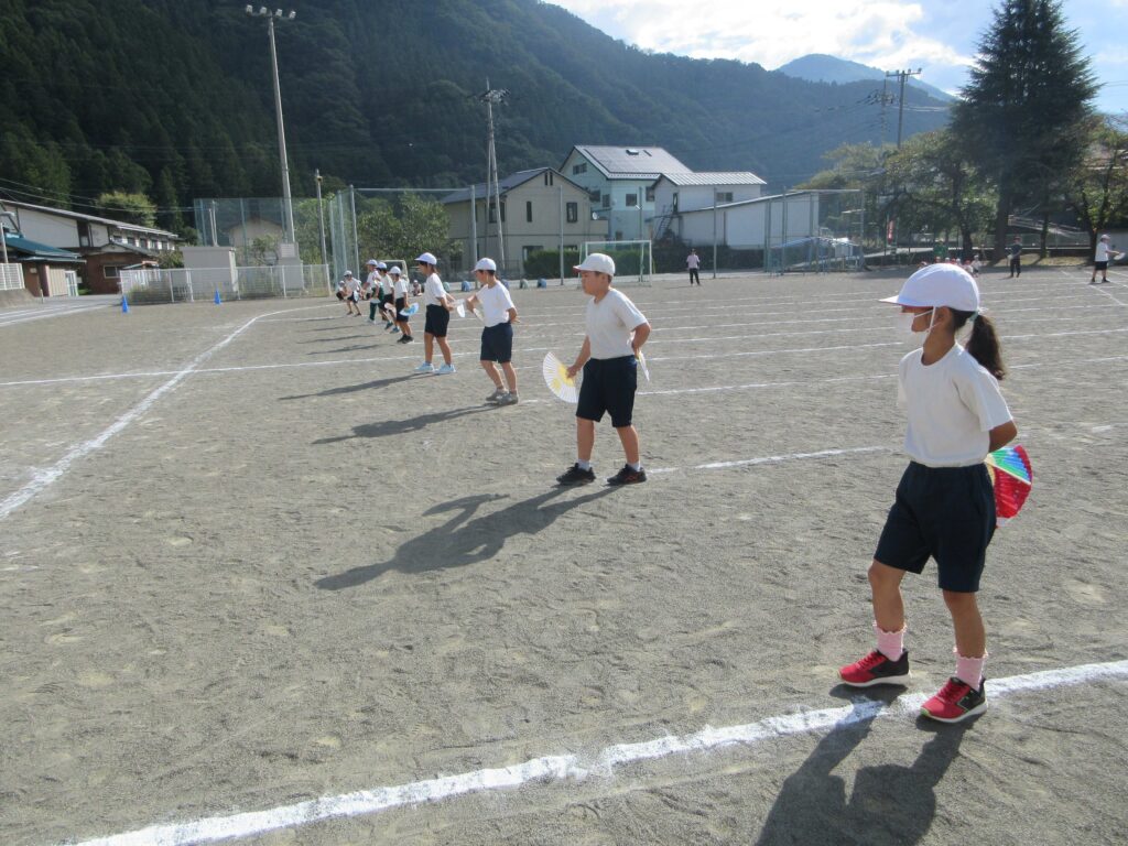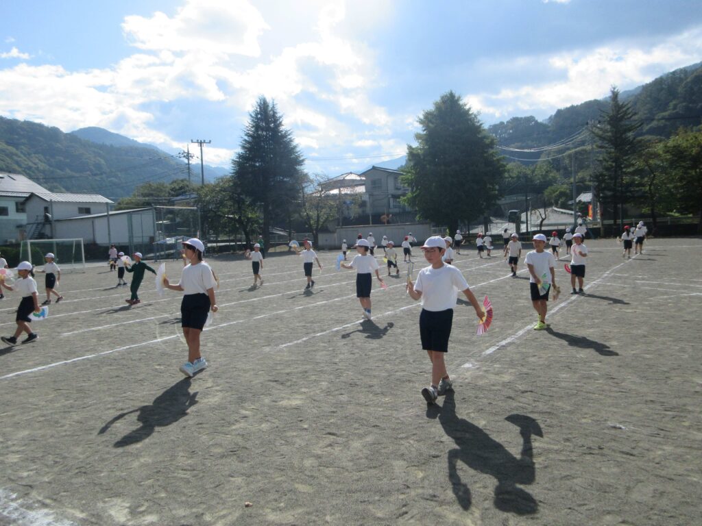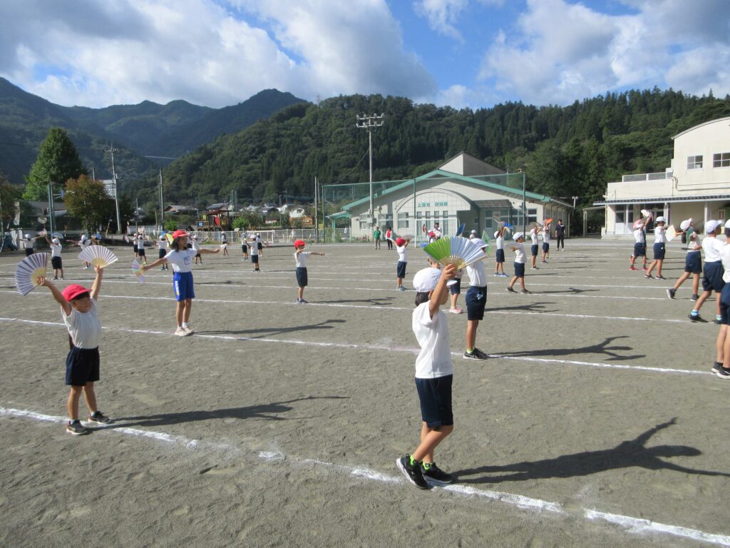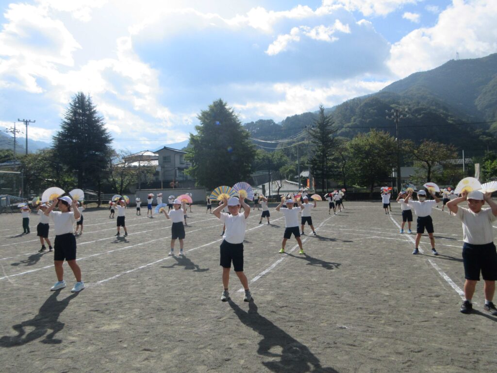 今日のダンス練習は、各自が色を使って仕上げた扇子を使って、練習しました。青空にいろいろな色の扇子が映えていました。