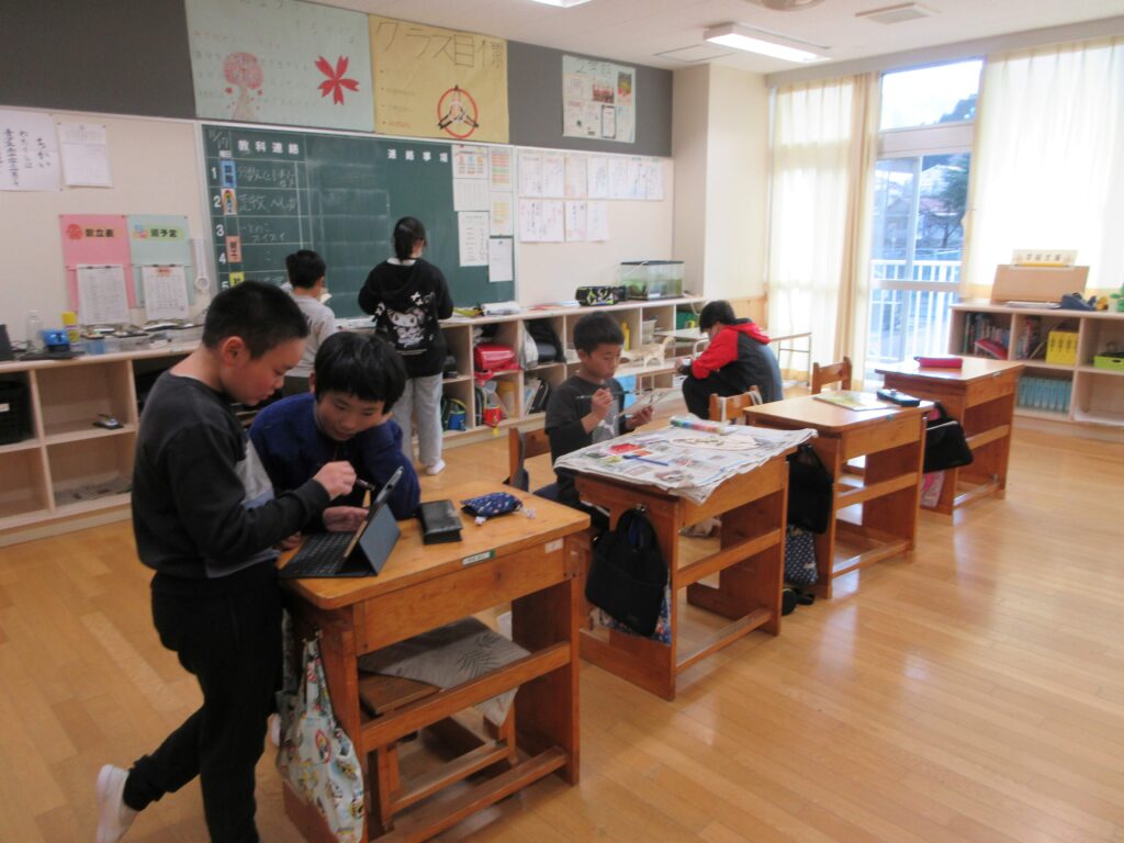 5年生図工。「いとのこを使って」の学習を行いました。本時は、作品を組み合わせて色塗りを行いました。できあがった児童は、作品の解説を作っていました。