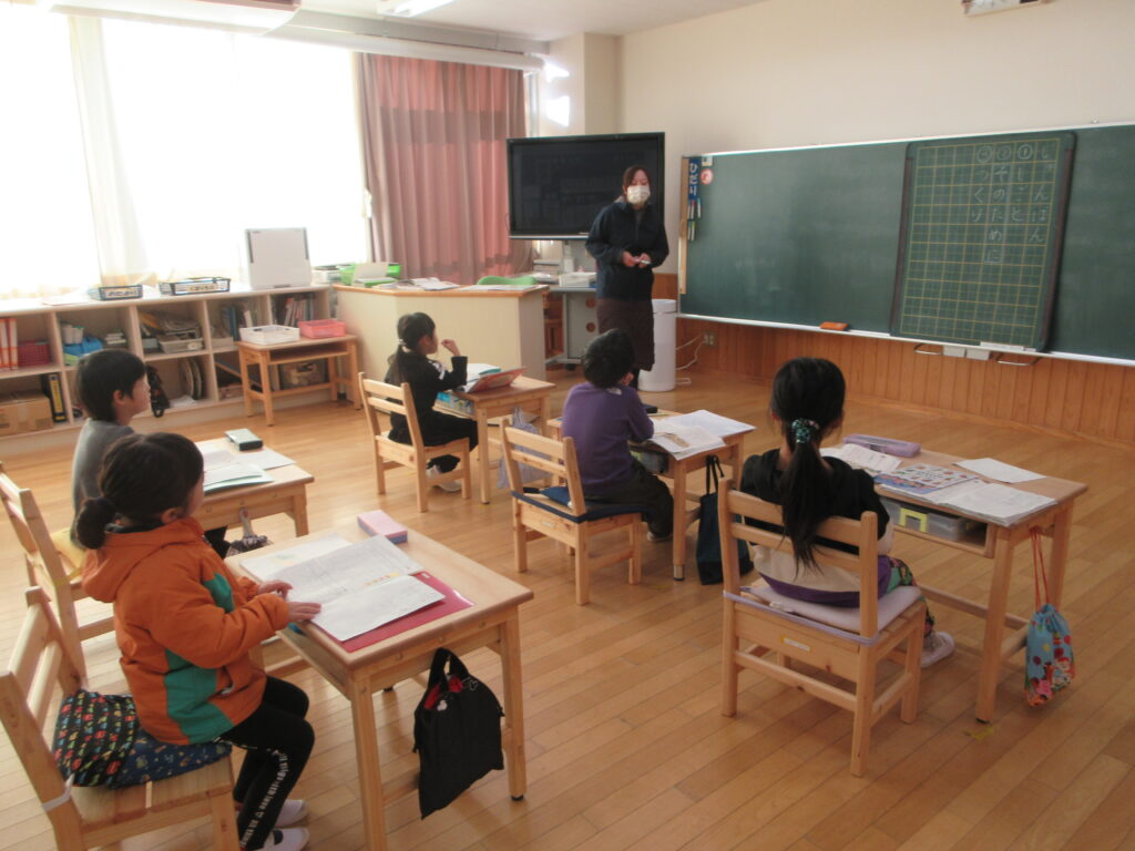 1年生国語。「じどうしゃくらべ」の学習を行いました。しごととつくりの順番で文章が書かれている訳を考えていました。