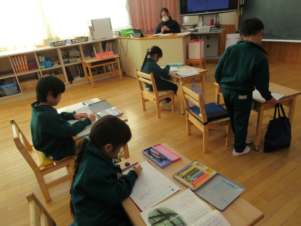 1年生国語。「たぬきの糸車」の学習を行いました。好きな場面を選んで、場面の絵と好きな理由を考えていました。