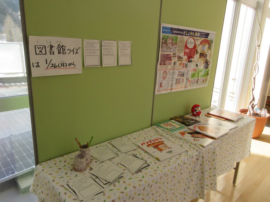 図書館に行ってみると、司書の先生がバレンタインコーナーを設置して関連図書を紹介していました。反対側では、図書委員がクイズを出していました。図書館に足を運び、本の貸し出しが進むような工夫がなされていました。