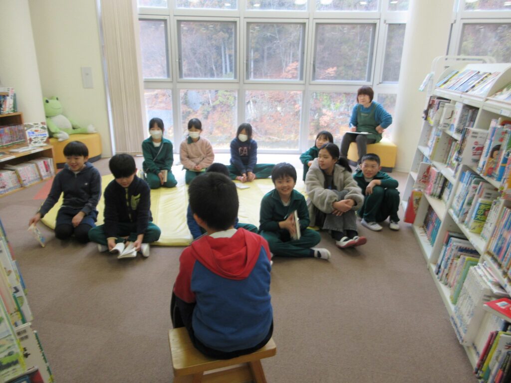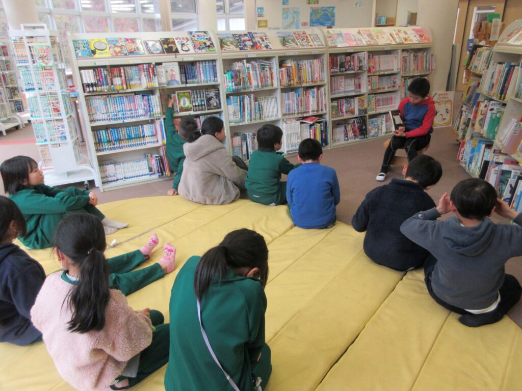 4年生の国語。この時間は、図書館で本の紹介を行っていました。毎週火曜日は司書さんが読み聞かせを行ったり、本の貸し出しを行ったりして読書活動を推進しています。今日は、一人一人が読んでおもしろかった本の紹介を行っていました。友達からも積極的に質問が行われていました。