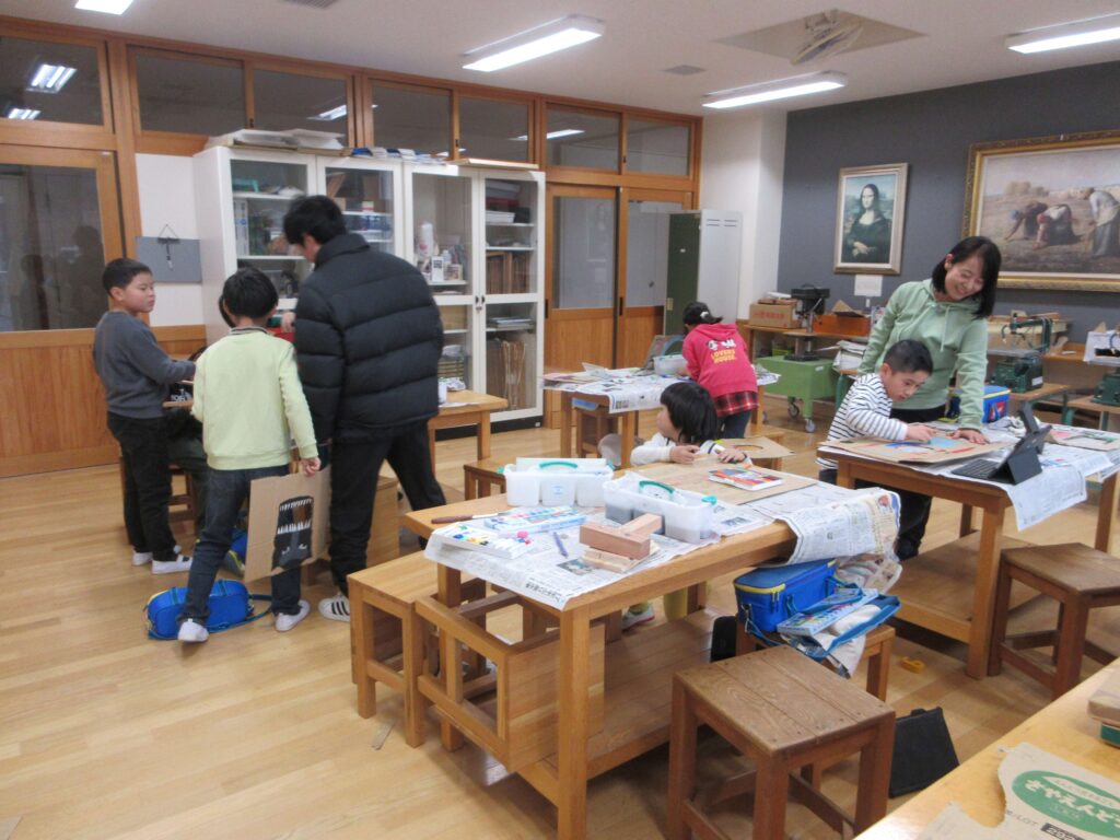 3年生図工。「ダンボールを使って」作品を作りました。切って穴を作り、それを生かした作品を作りました。