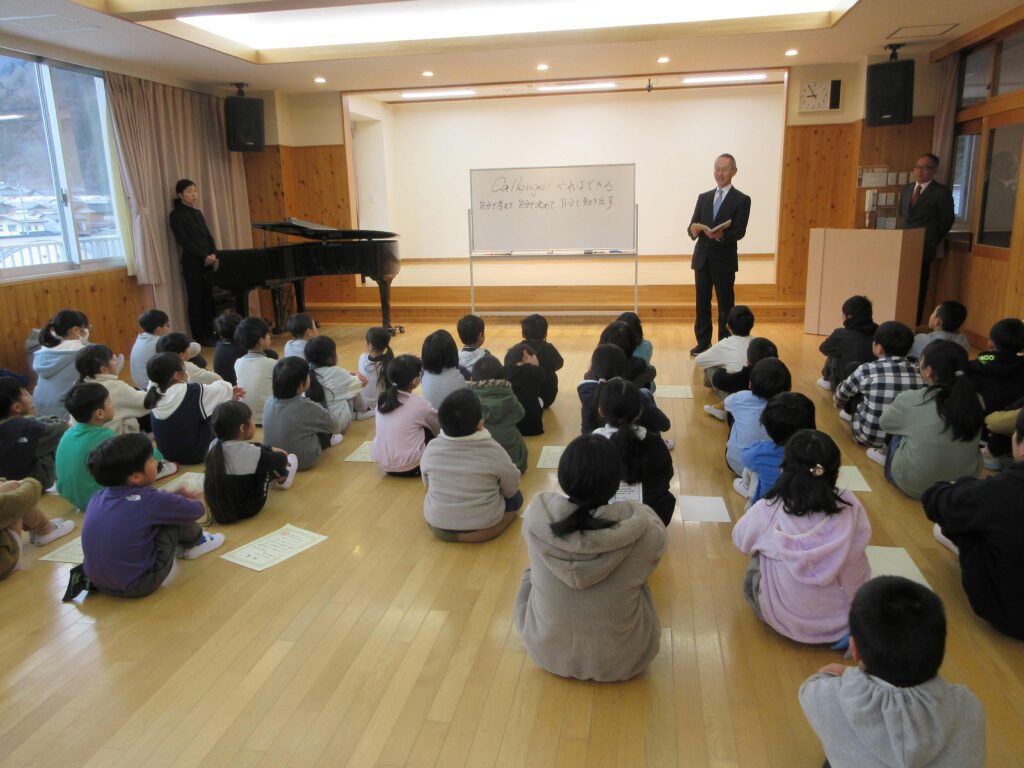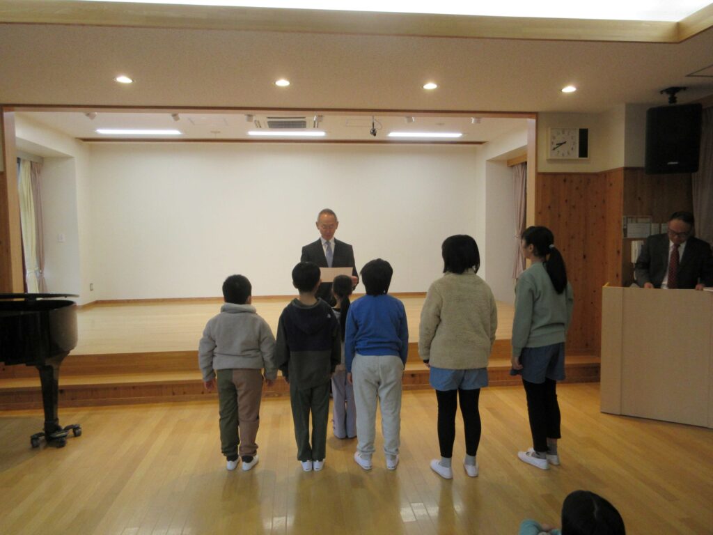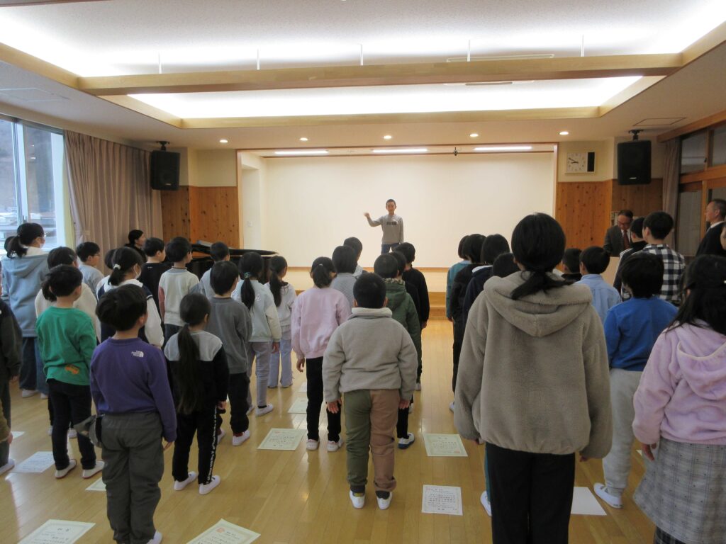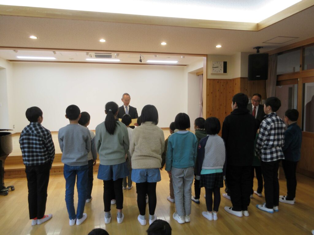 表彰と2学期の振り返りを行った後、2学期終業式を行いました。校長先生からは、何か一つを達成すると力が付いてまた次に向かおうとするやる気につながる、みんなは着実に力が付いている、自信をもってほしいとのお話がありました。1月7日に元気にお会いしましょうと伝えていました。