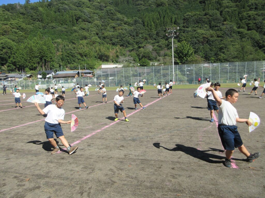 今日のダンス練習は、各自が色を使って仕上げた扇子を使って、練習しました。青空にいろいろな色の扇子が映えていました。